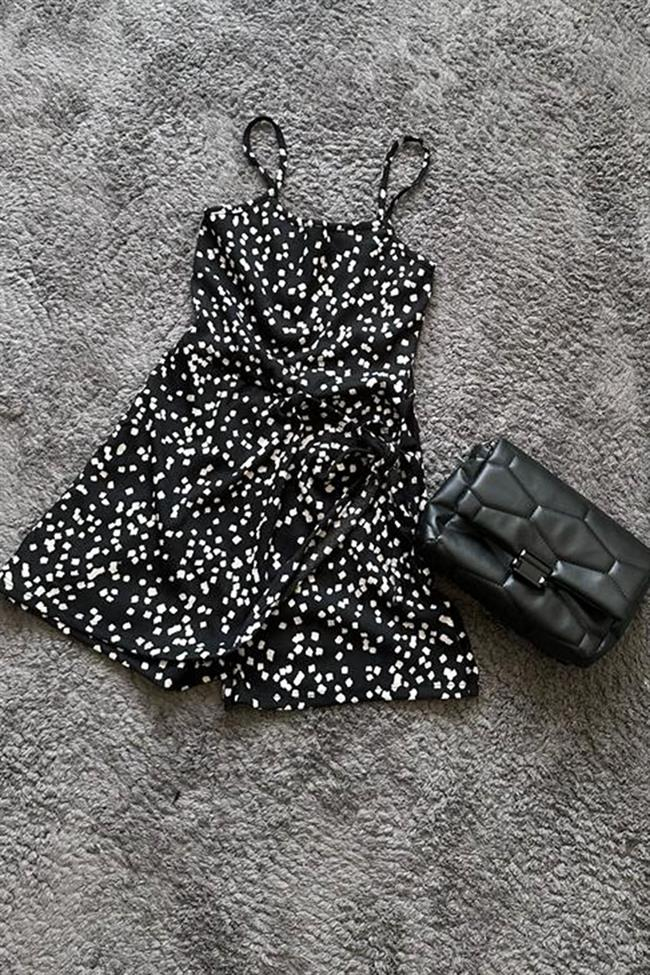 Kadın Çiçek Desen Yandan Bağlamalı Şort Tulum - SİYAH
