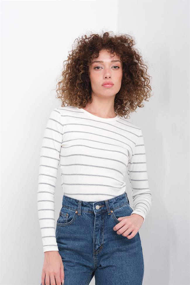 Kadın Çizgili Bisiklet Yaka Body - GRİ