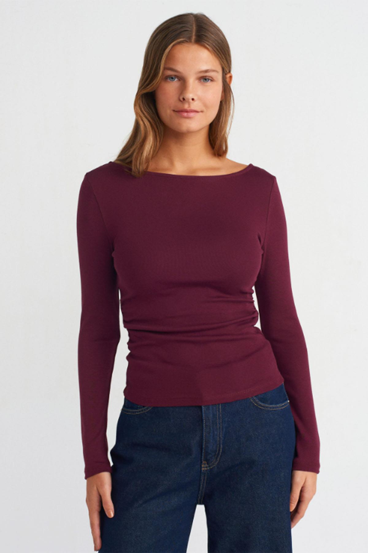 Kadın Büzgülü Kayık Yaka Body Top - BORDO
