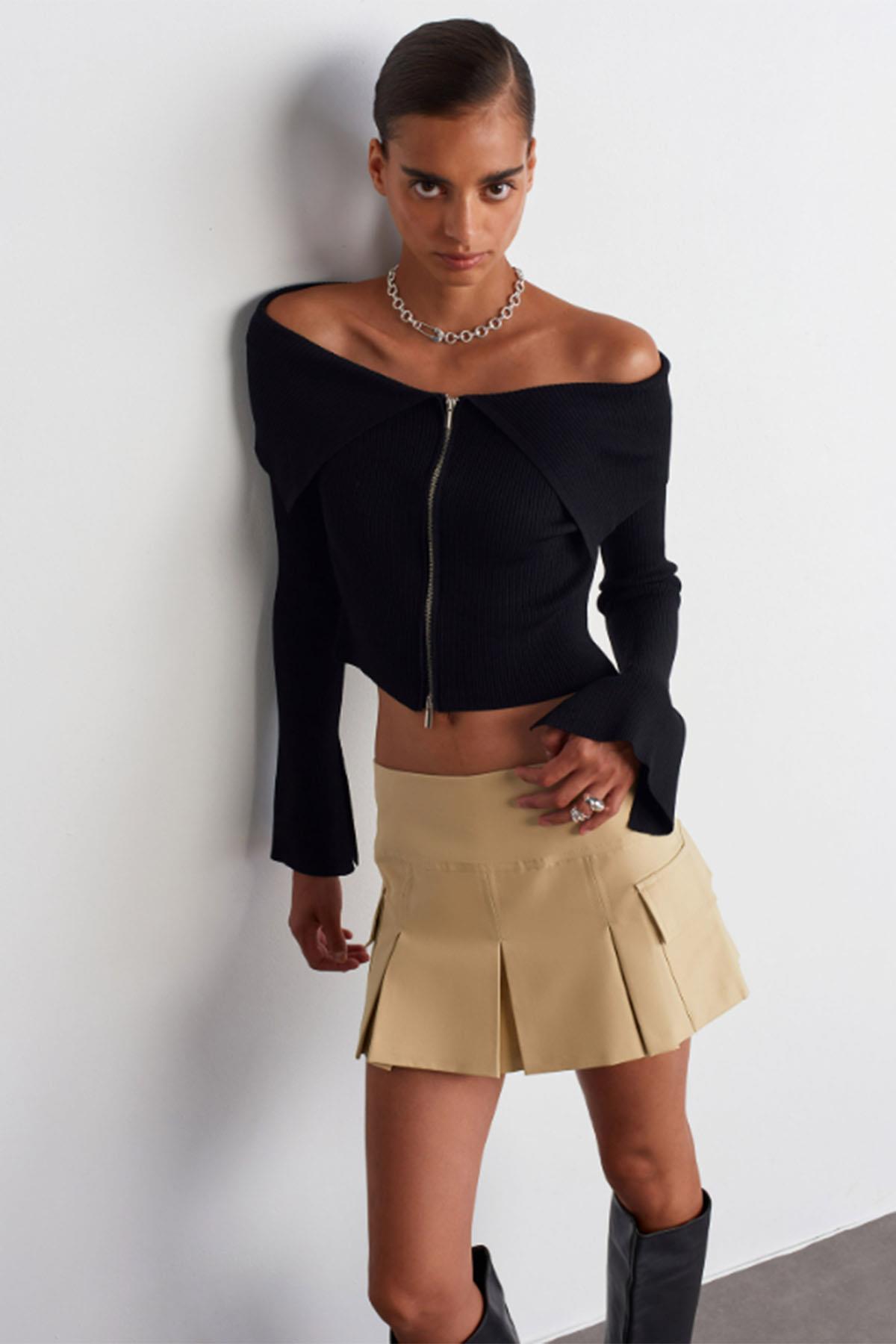 Kadın Bardot Yaka Kolu Yırtmaç Detaylı Fermuarlı Triko Hırka - SİYAH