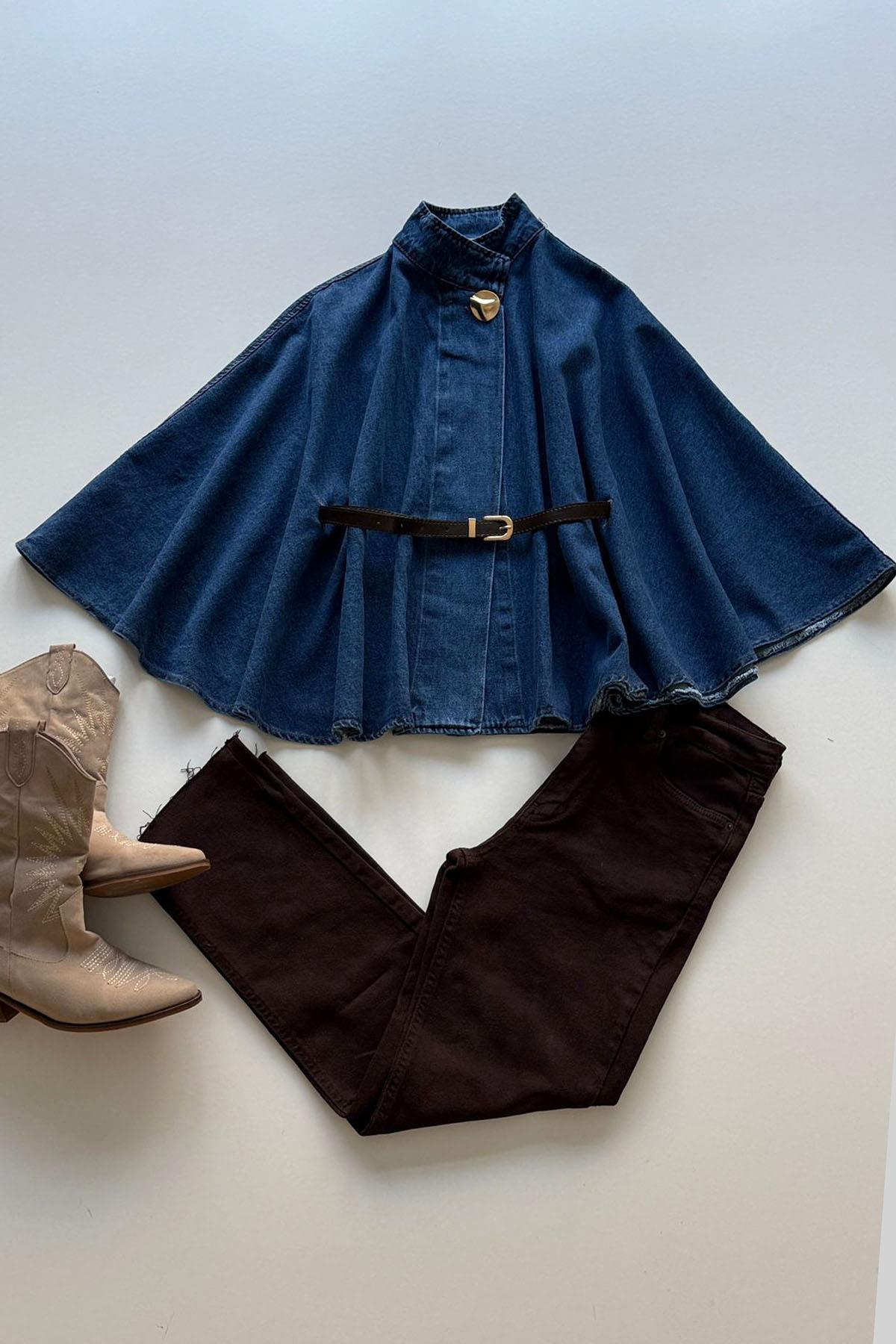 Kadın Denim Kemerli Düğme Detaylı Panço - DENİM