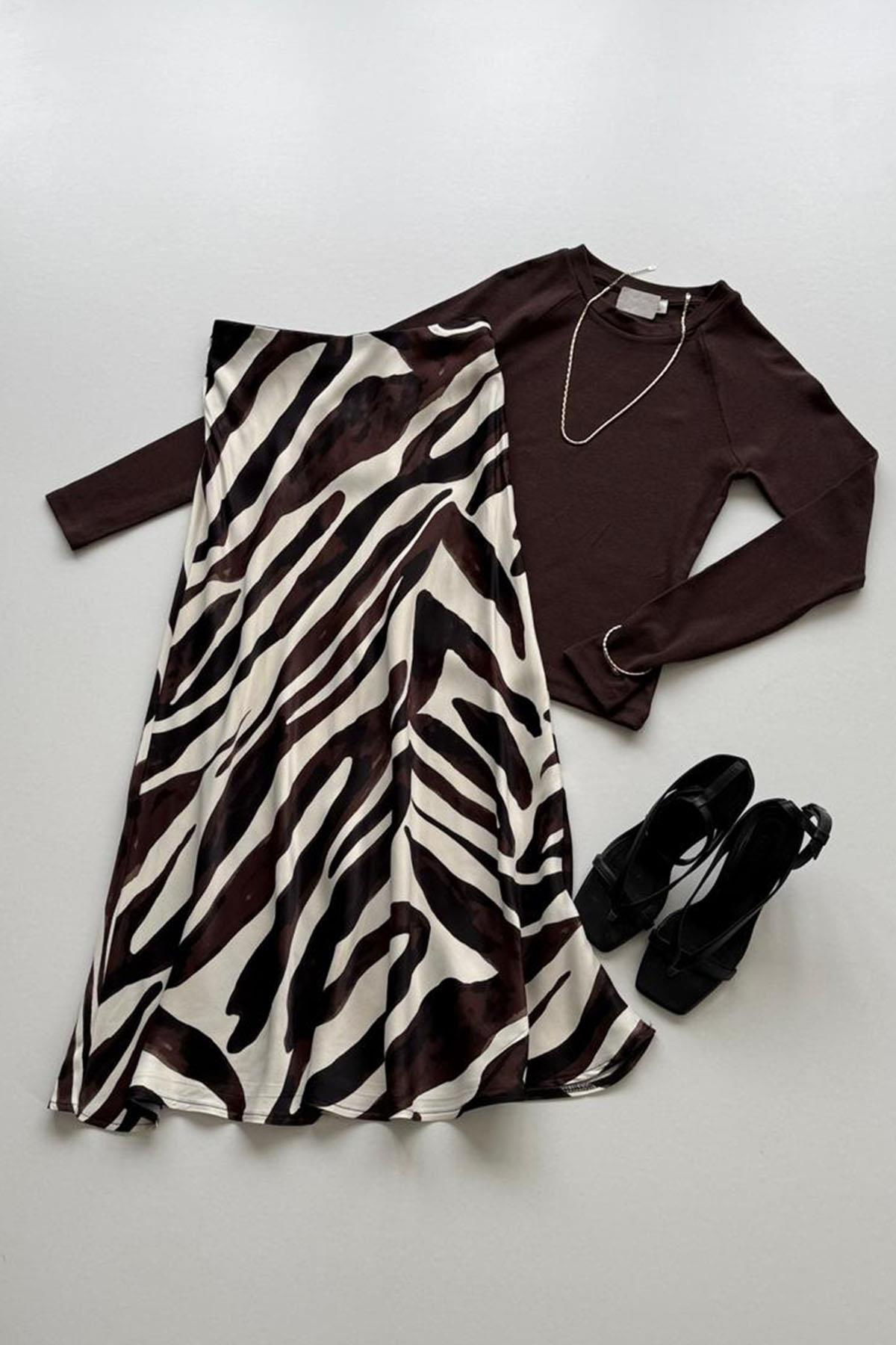 Kadın Kahve Zebra Desenli Saten Etek - KAHVE