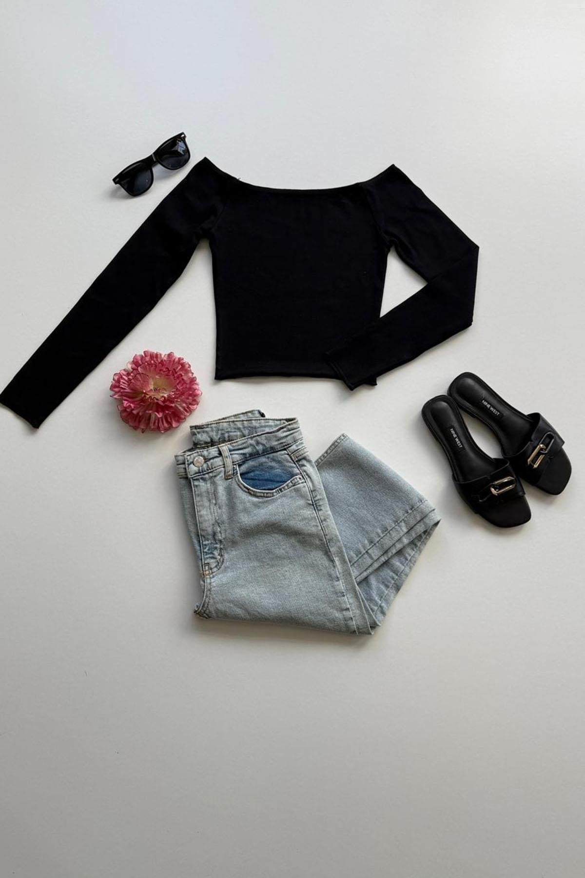 Kadın Kayık Yaka Uzun Kol Body - SİYAH