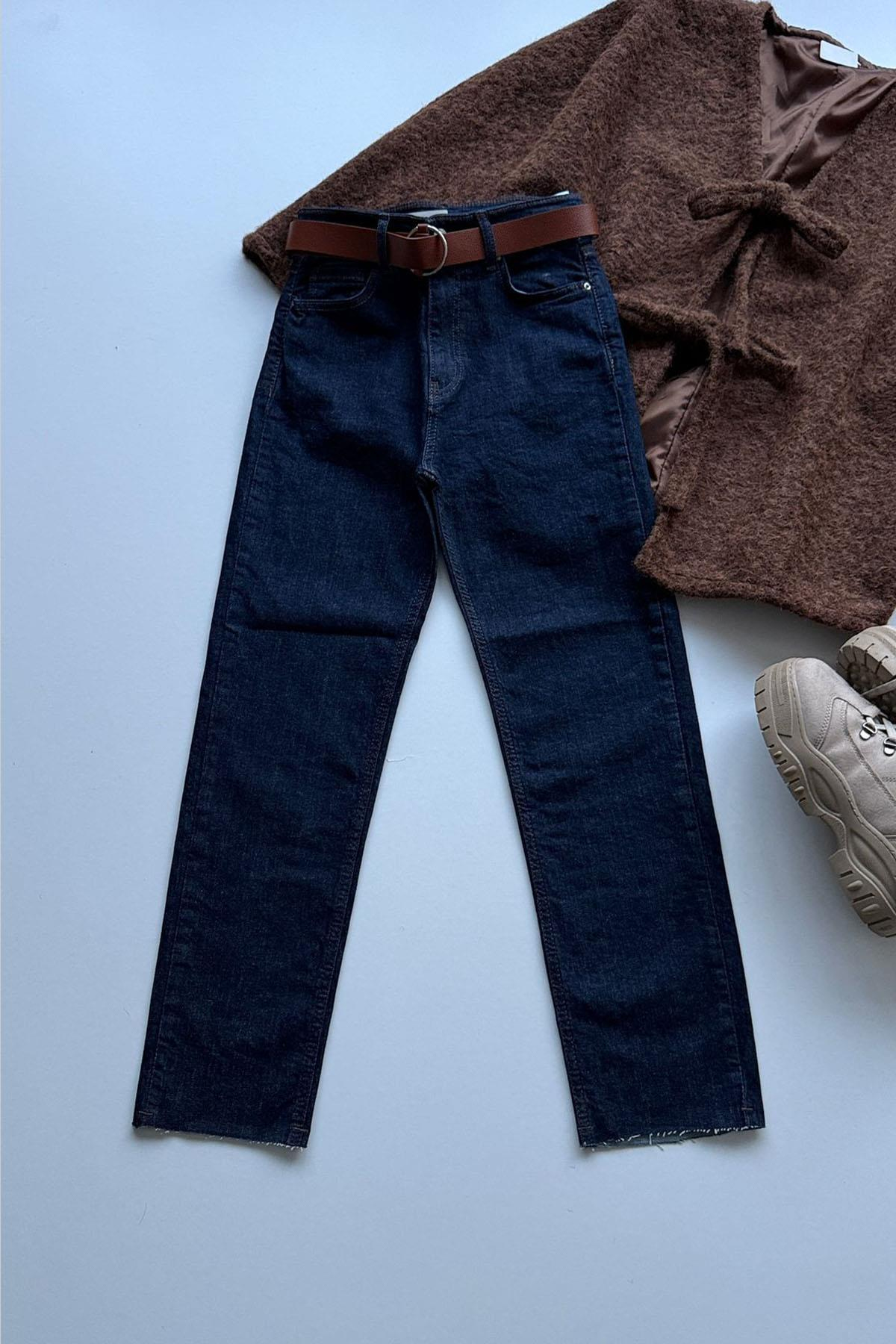 Kadın Kemerli Paçası Kesik Lacivert Jean - LACİVERT