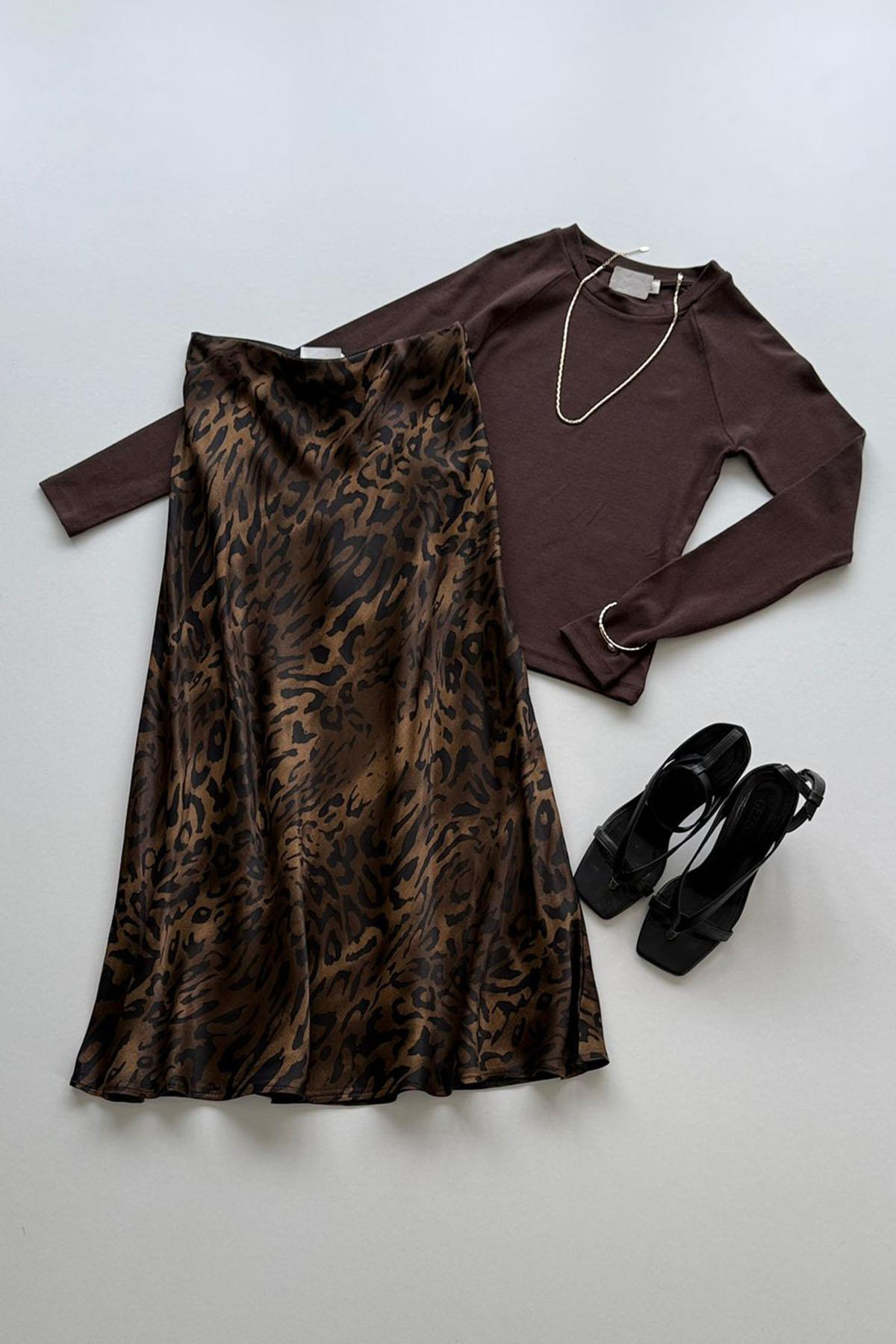 Kadın Leopar Desenli Saten Etek - KAHVE