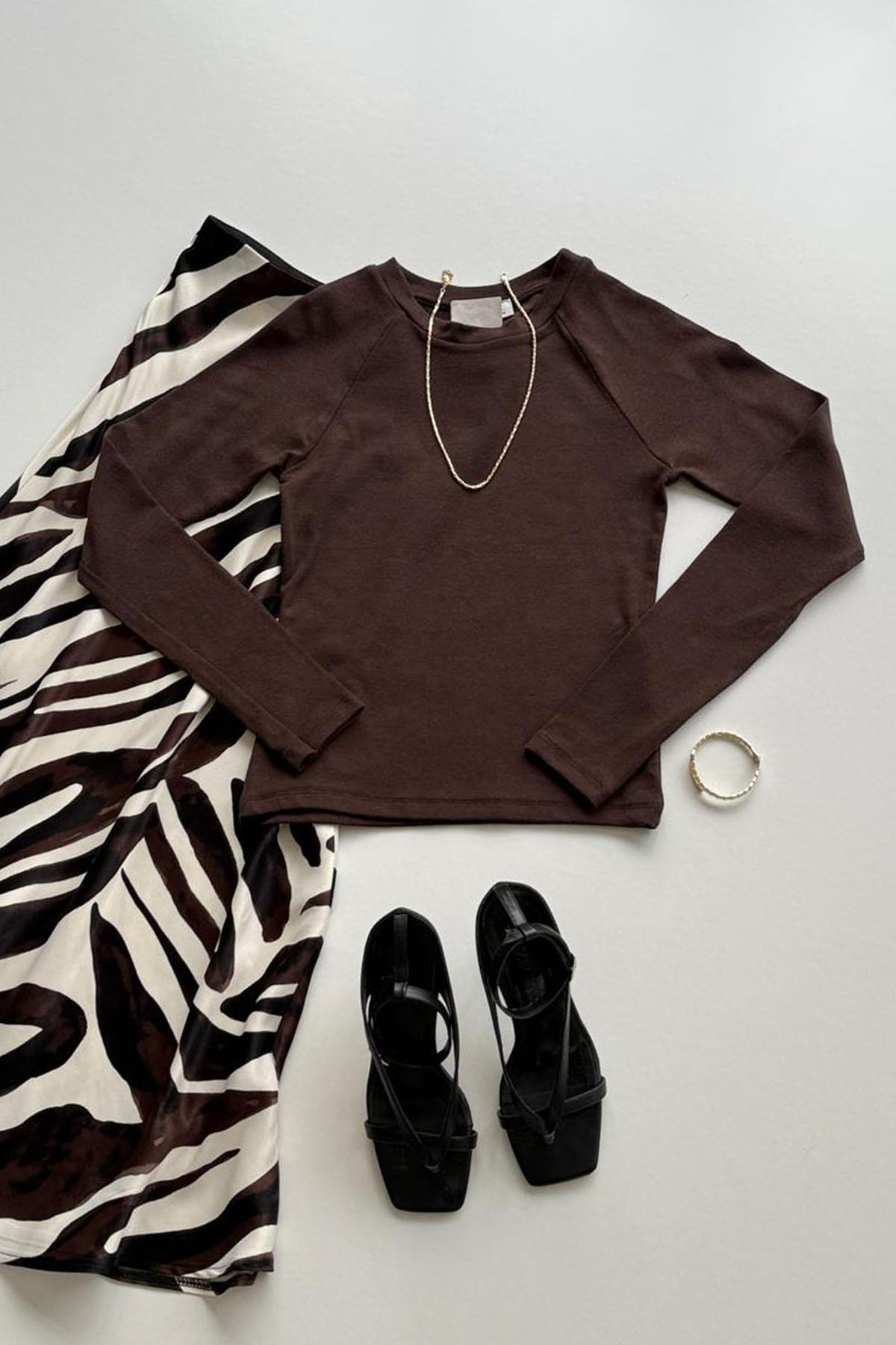 Kadın Sıfır Yaka Reglan Kol Parçalı Body - KAHVE