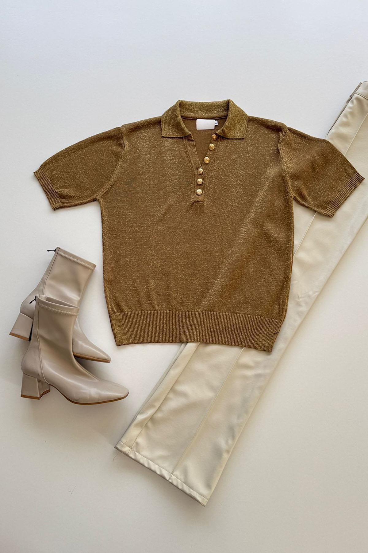 Kadın Simli Düğmeli Kısa Kollu Kazak - HAKİ